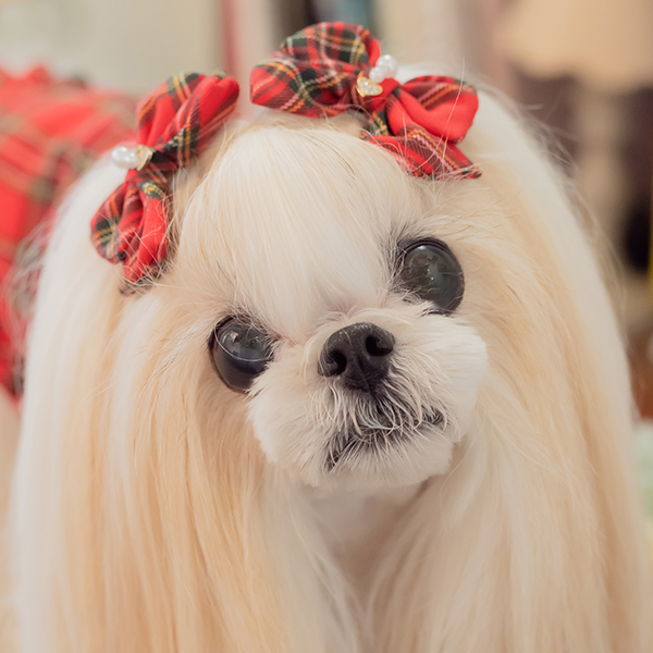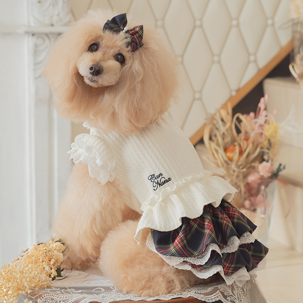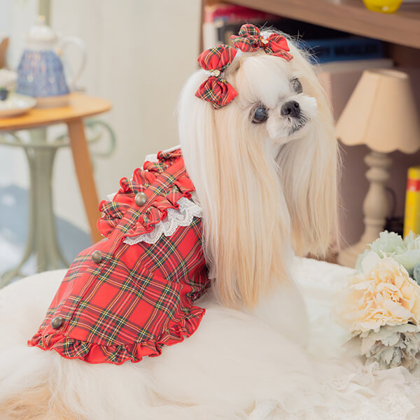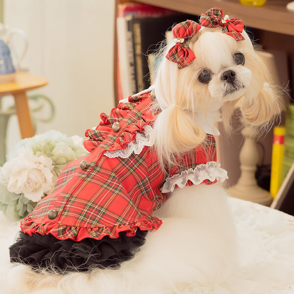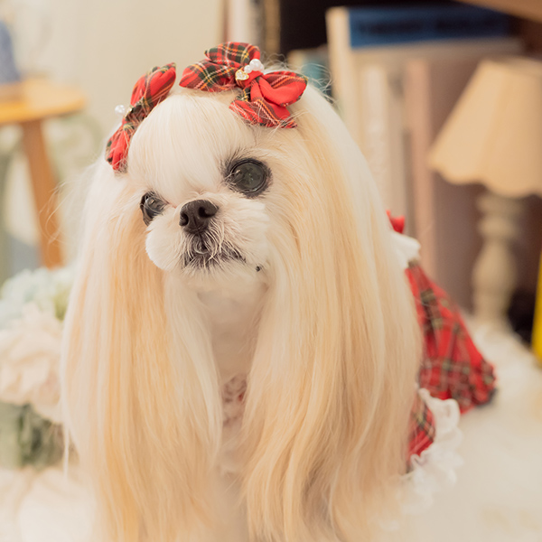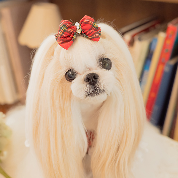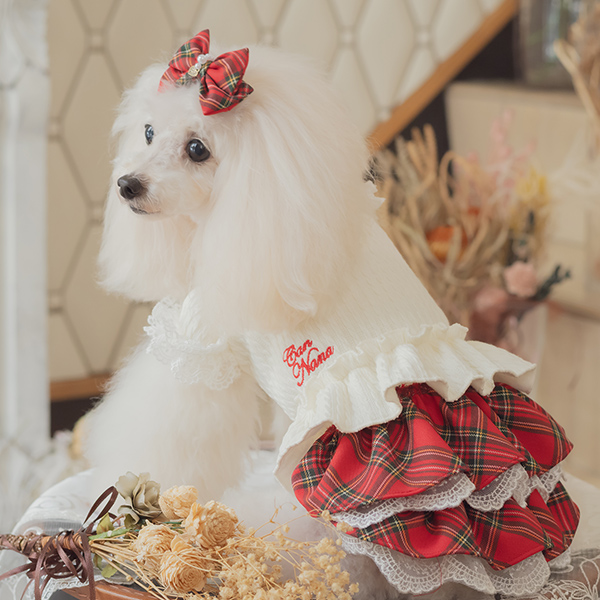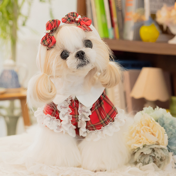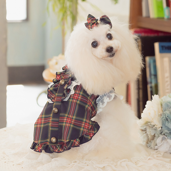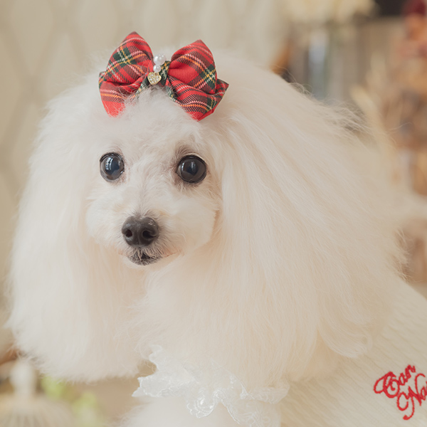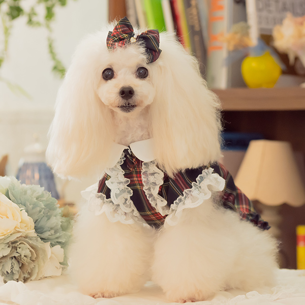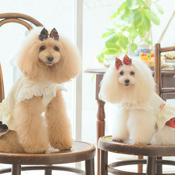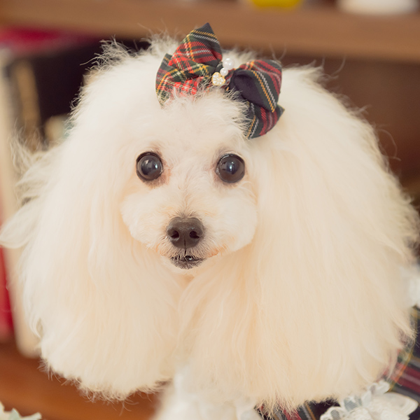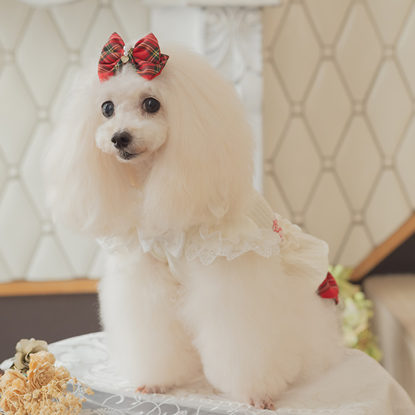 白い毛のワンちゃんに濃色のウェア・アクセサリーを着用する際には十分注意してください。