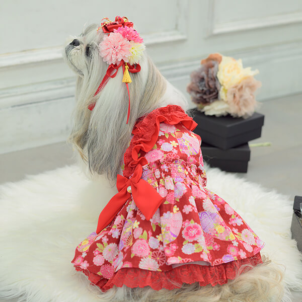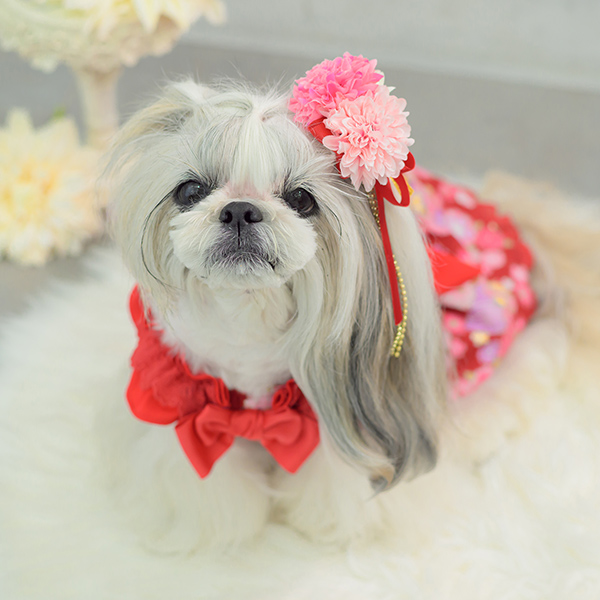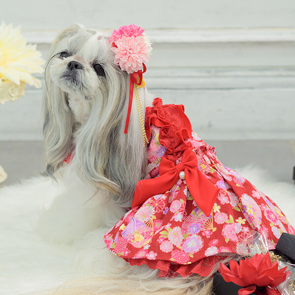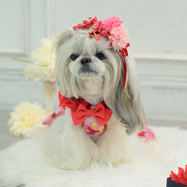 白い毛のワンちゃんに濃色のウェア・アクセサリーを着用する際には十分注意してください。