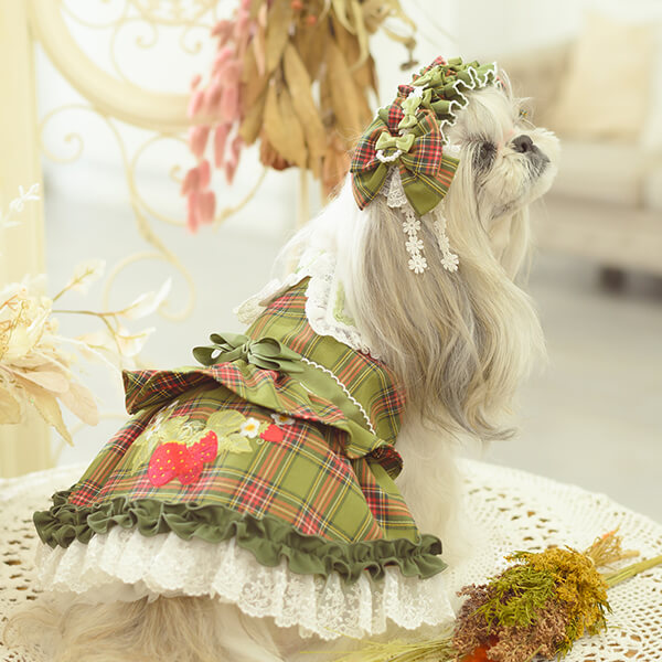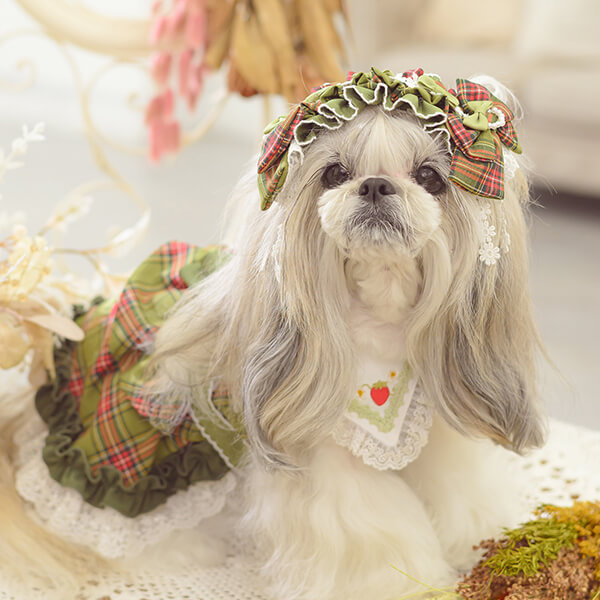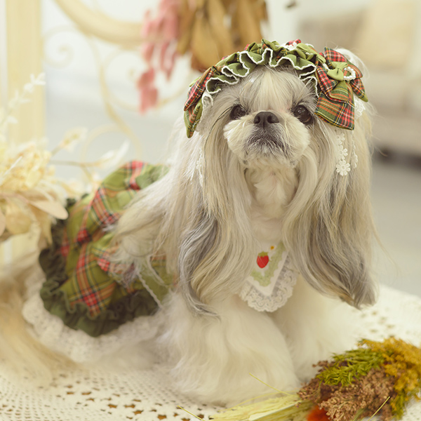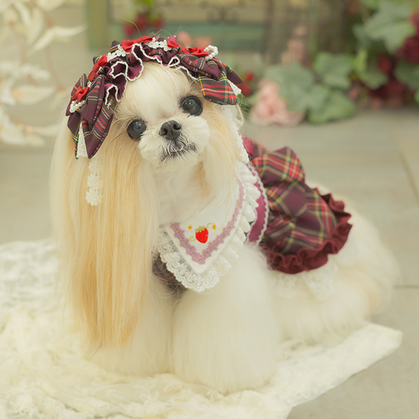 白い毛のワンちゃんに濃色のウェア・アクセサリーを着用する際には十分注意してください。