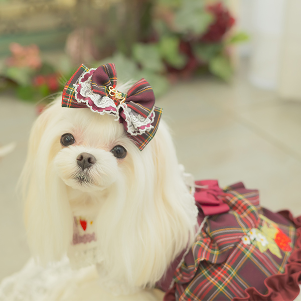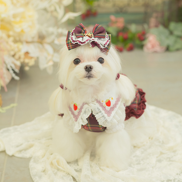 白い毛のワンちゃんに濃色のウェア・アクセサリーを着用する際には十分注意してください。