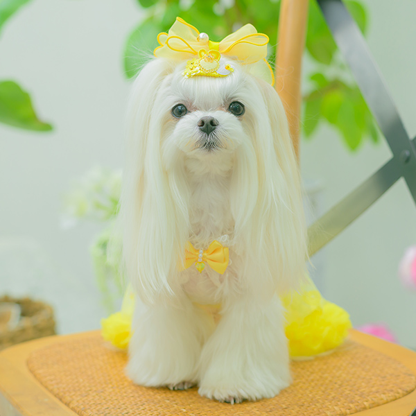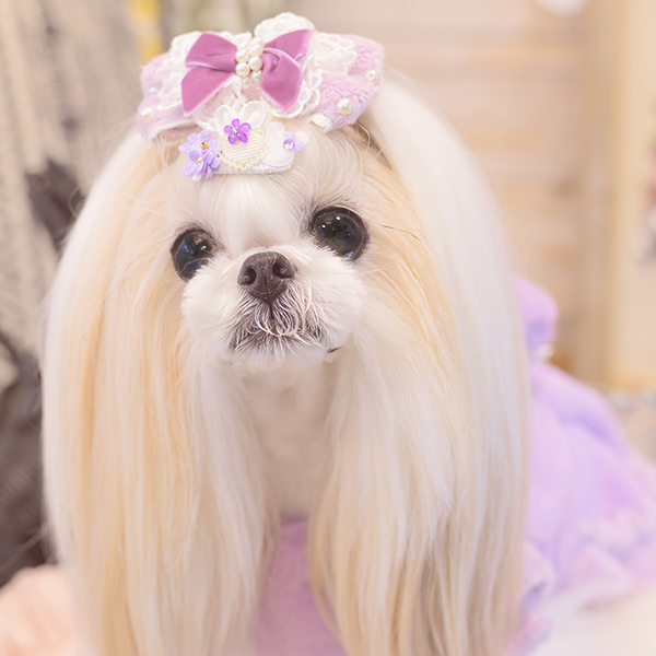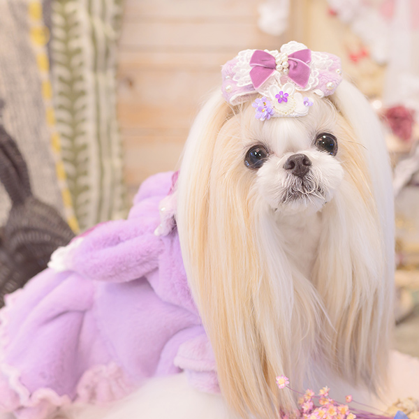 白い毛のワンちゃんに濃色のウェア・アクセサリーを着用する際には十分注意してください。