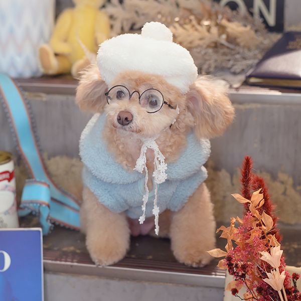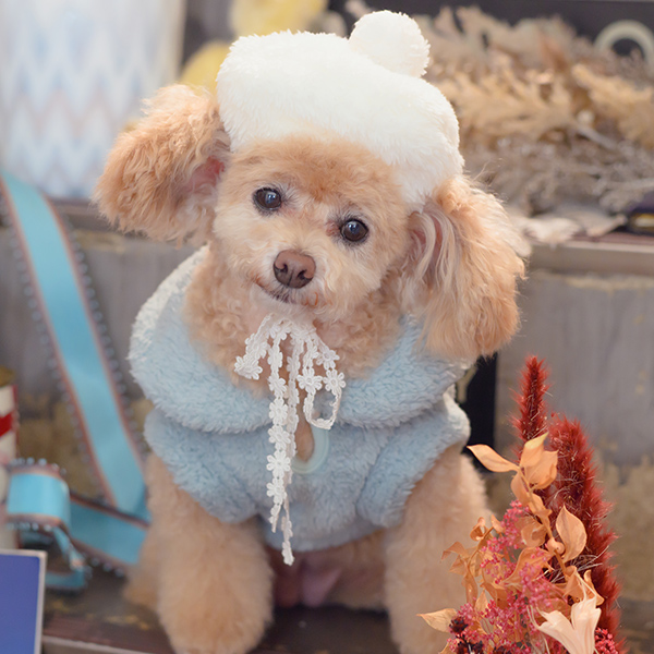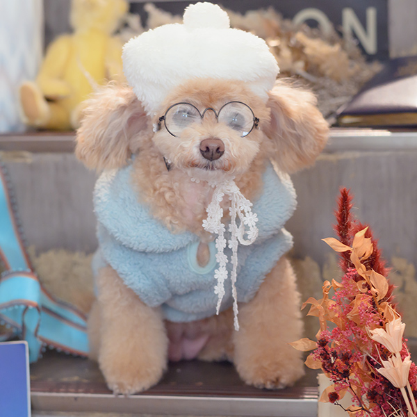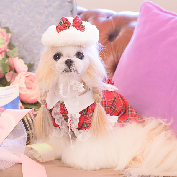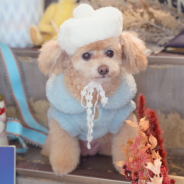 白い毛のワンちゃんに濃色のウェア・アクセサリーを着用する際には十分注意してください。