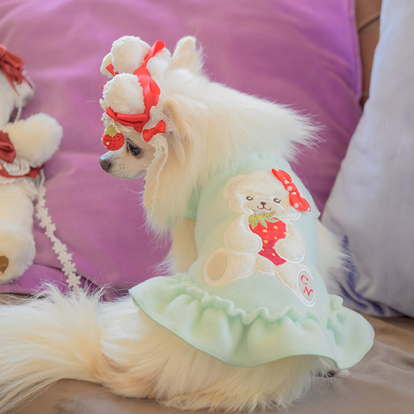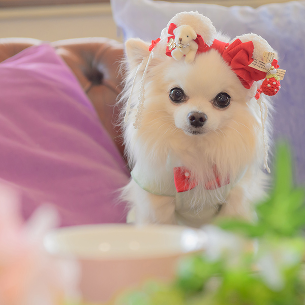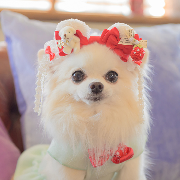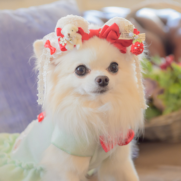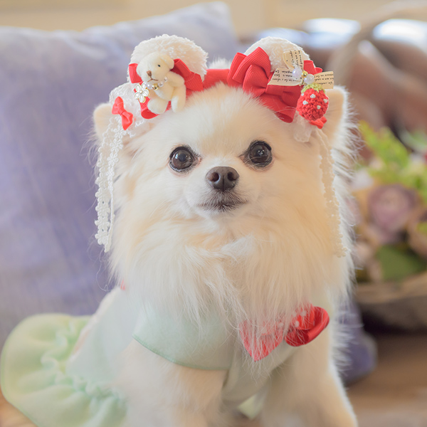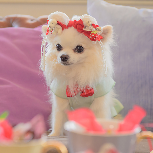 白い毛のワンちゃんに濃色のウェア・アクセサリーを着用する際には十分注意してください。