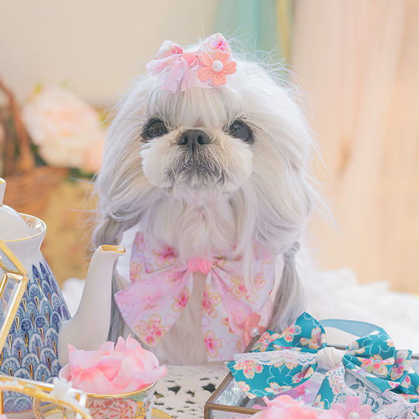 白い毛のワンちゃんに濃色のウェア・アクセサリーを着用する際には十分注意してください。