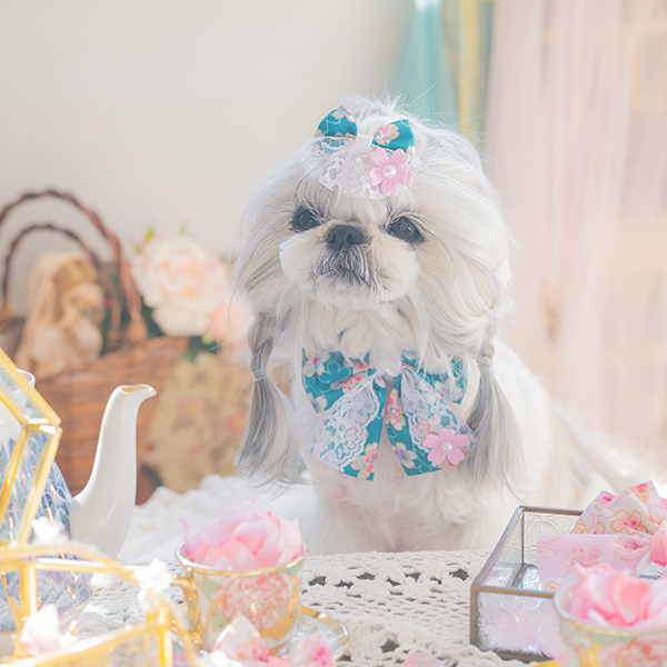 白い毛のワンちゃんに濃色のウェア・アクセサリーを着用する際には十分注意してください。