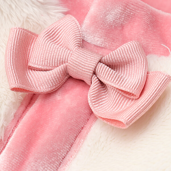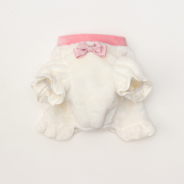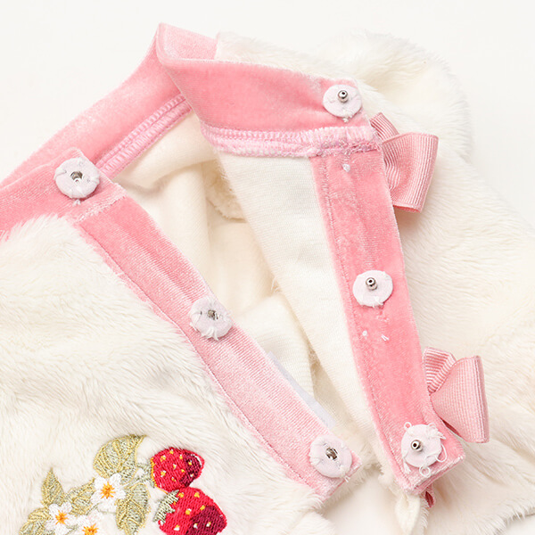 首まわり、前立てはベロア素材で配色にすることでアクセントになり、仕様は背中開きのスナップボタンなので、着せやすさ、脱ぎやすさも抜群です。