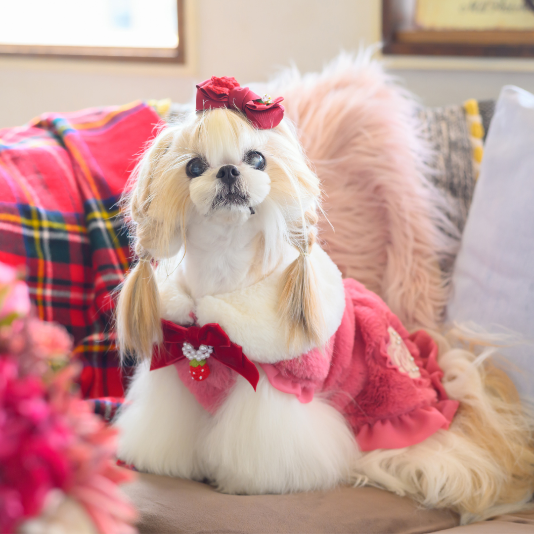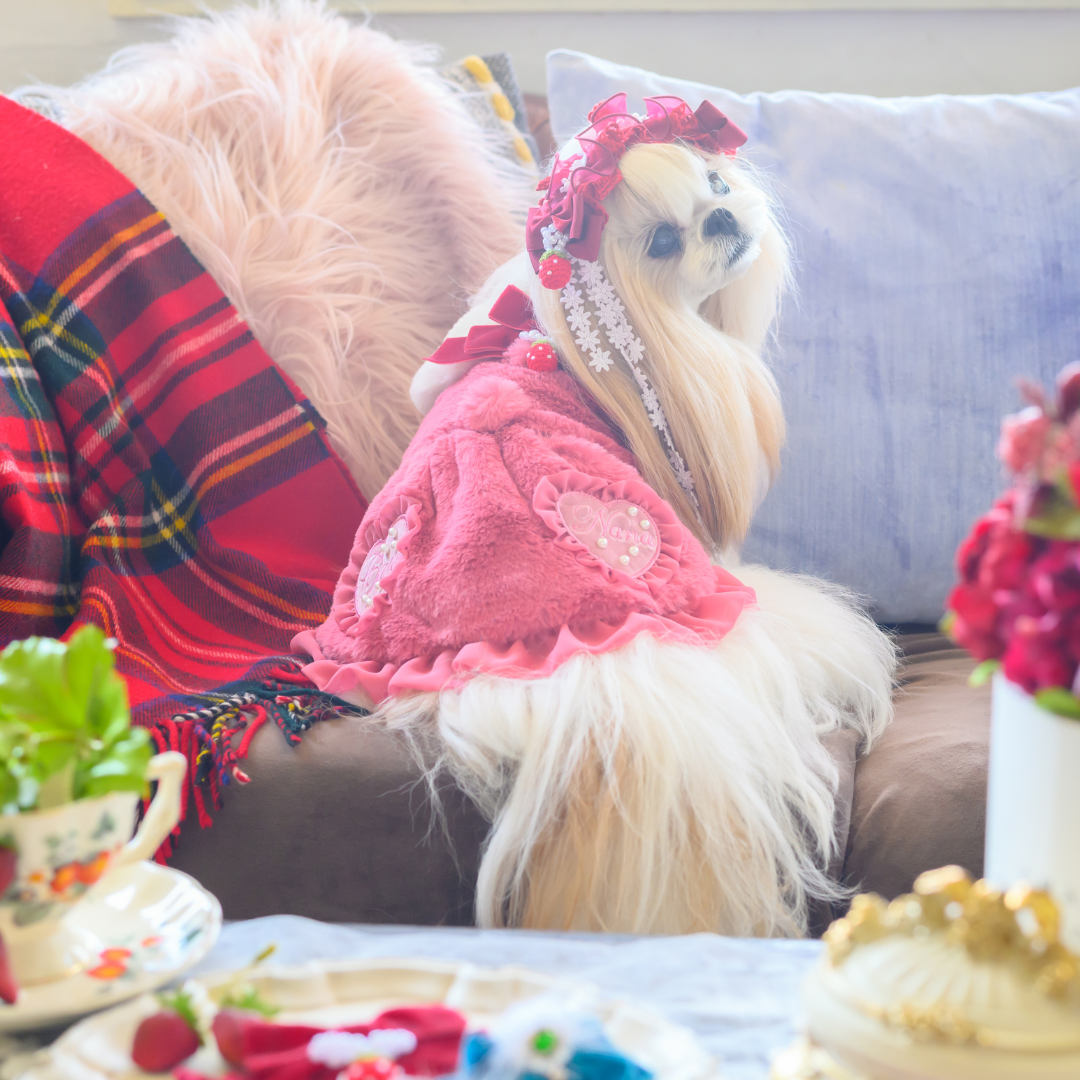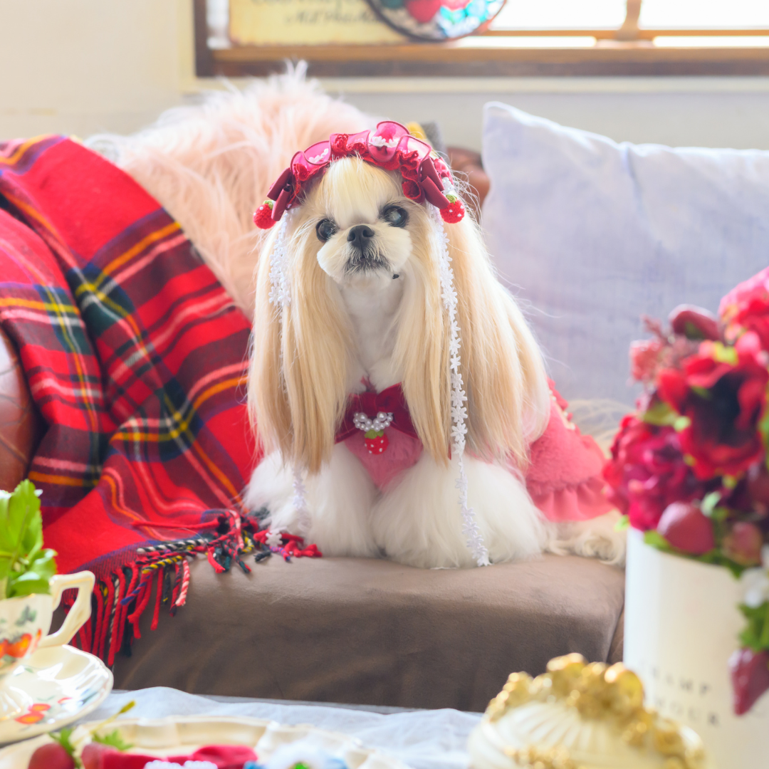 白い毛のワンちゃんに濃色のウェア・アクセサリーを着用する際には十分注意してください。