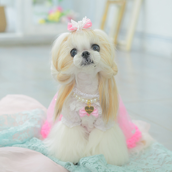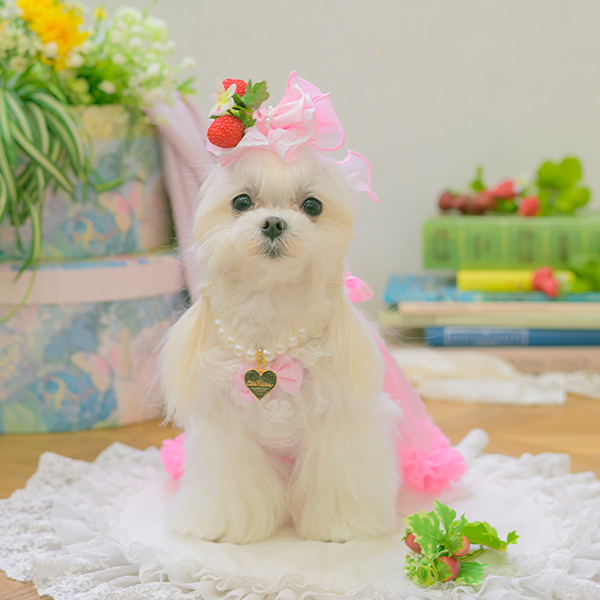 白い毛のワンちゃんに濃色のウェア・アクセサリーを着用する際には十分注意してください。