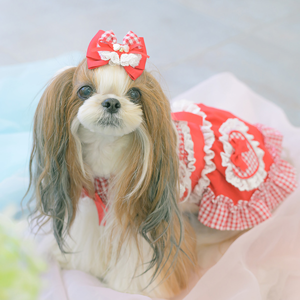 白い毛のワンちゃんに濃色のウェア・アクセサリーを着用する際には十分注意してください。