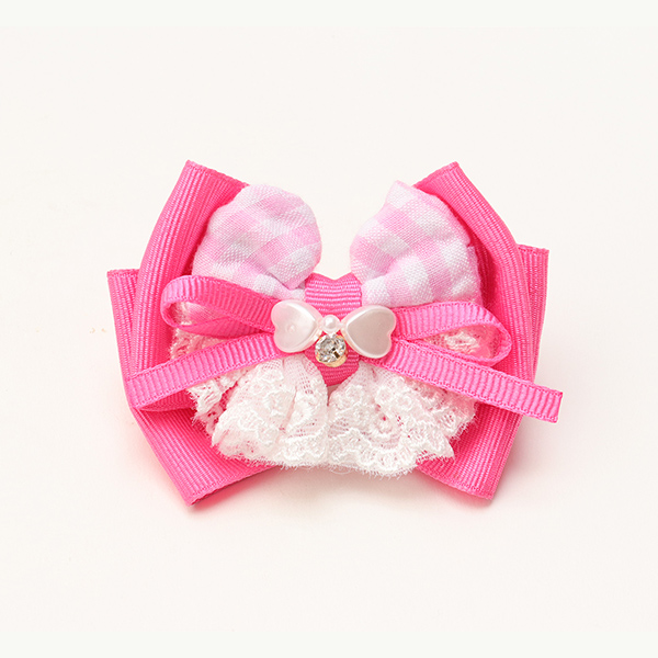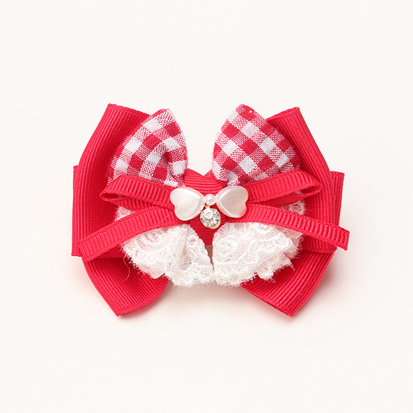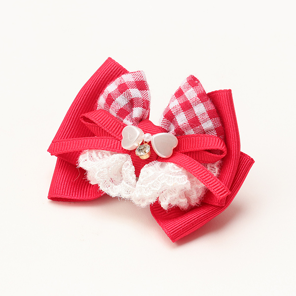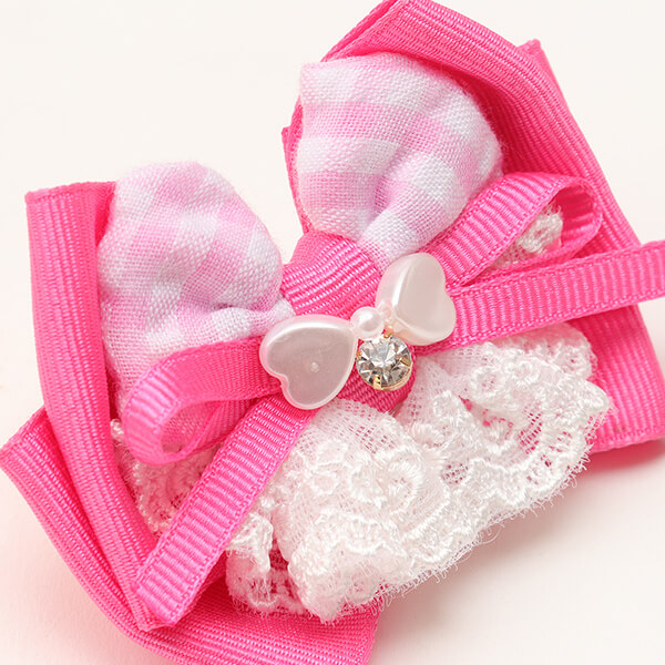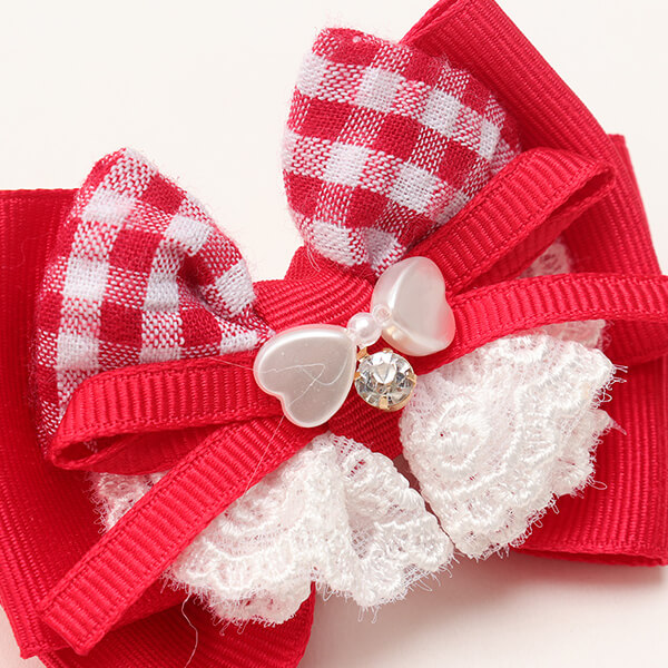 ハートギンガムワンピースとリンクコーデが叶うバレッタです。レースフリルはギャザーたっぷりでリッチな雰囲気。ハートビーズや、チェック柄を巧みに組み合わせてボリューム感を追及しつつ、重くなりすぎないように仕上げました。