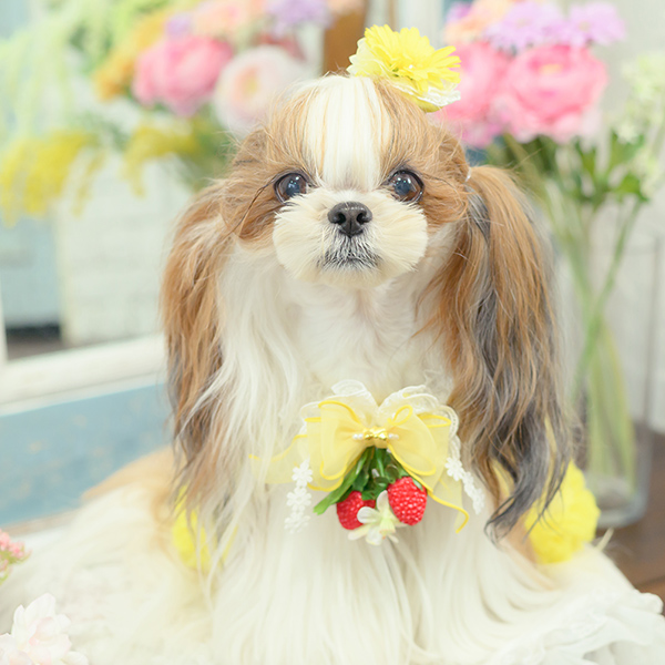 白い毛のワンちゃんに濃色のウェア・アクセサリーを着用する際には十分注意してください。